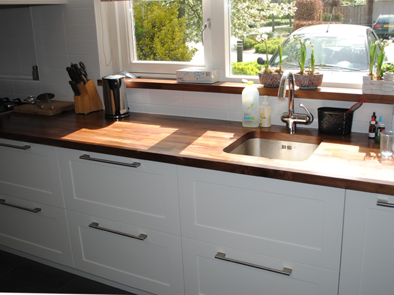 Doordat de linker buitenmuur schuin loopt en er een schuin dak op de uitbouw zit was deze klus alleen te realiseren met een maatwerkkeuken. De fronten zijn gemaakt van mdf met een glad paneel erin. De fronten zijn gespoten in de zijdeglans kleur wimborne white van Farrow & Ball. Het blad en de vensterbank zijn gemaakt van massief Europees noten en zijn gespoten met blankelak glans 2. De spoelbak zit onder het blad gemonteerd. Zodat de roestvrij stalen rand niet zichtbaar is en het oppervlak van het notenblad niet verstoort.