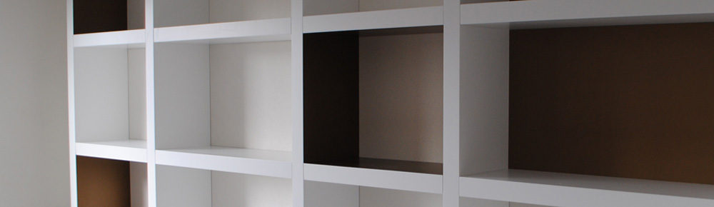 Mdf kastenwand gespoten in witte zijdeglans lak Ral 9003 en een aantal vakken gespoten in ral 1036 metallic goudkleur. Door de spelling met de kleuren geeft het echt een modern en ook speels effect.